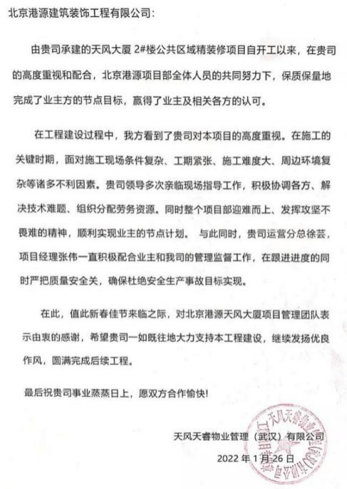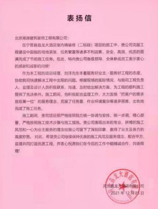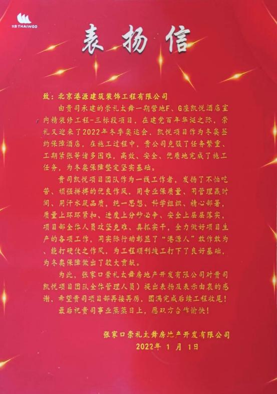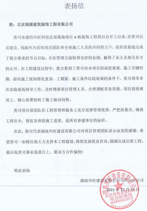 一封封表?yè)P信、感謝信,是對港源品牌的認可,也是對全體項目管理人員付出的肯定,更是鞭策我們不斷提高服務(wù)質(zhì)量的動(dòng)力。在今后的施工管理服務(wù)中,北京港源將堅持以“讓客戶(hù)更滿(mǎn)意”為宗旨,以適應客戶(hù)的多樣化需求。